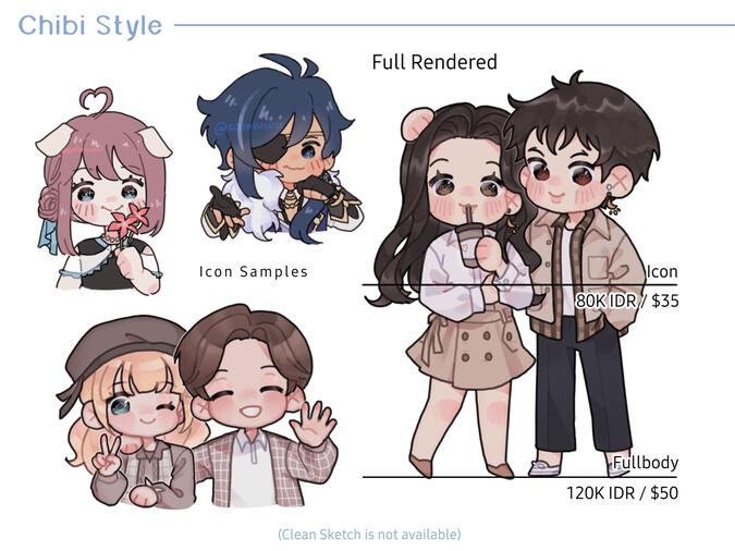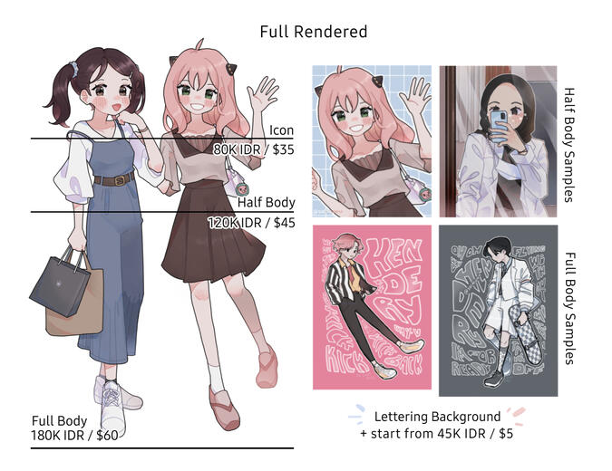 Bebas request warna polos untuk background. Background yang detail akan dikenai biaya tambahan mulai dari 45K IDR / $5, menyesuaikan kesulitan.