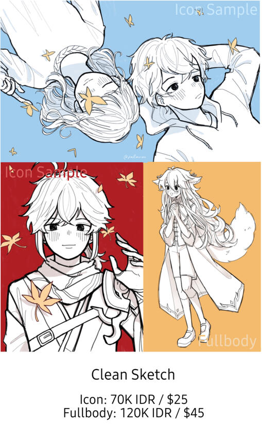 Bebas request warna polos untuk background. Background yang detail akan dikenai biaya tambahan mulai dari 45K IDR / $5, menyesuaikan kesulitan.